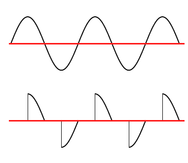 ※「電圧をいじる」は、とりあえず「100Vを50Vやら85Vやらいろんな電圧に変えるんだ」という理解でいいと思います。一応、高校物理を修めた(交流電圧がサインカーブであることを知っている)方向けに「調光された交流電圧の波形」を載せます。上が調光前、下が調光後です。サインカーブを切り刻んでいます。