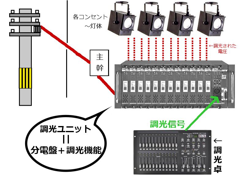 これは前回の記事の最後に出てきた模式図ですね。調光ユニットの機種が違いますが、役割は同じです。