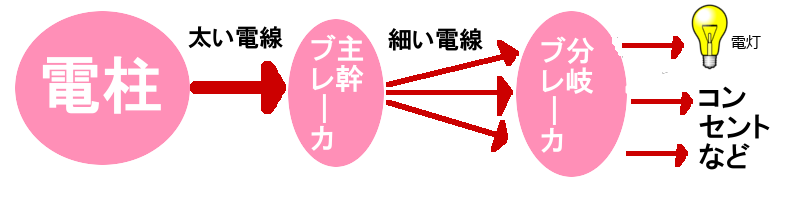 主幹ブレーカから電気をもらって、スポットライトに分けてあげています。これは分電盤、分岐ブレーカーと同じ役割です。