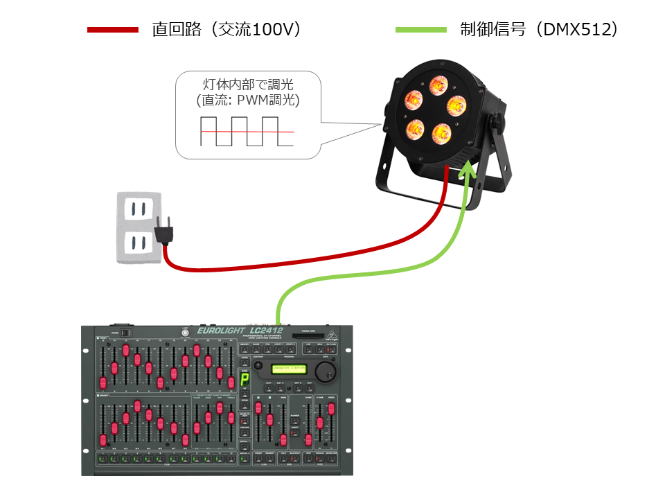 命令信号の規格はいろいろなものがありましたが、2025年現在では、「DMX512」という規格のデジタル信号が世界で一番使われています。