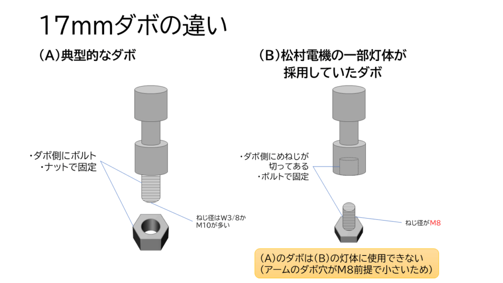 また、この機種に限ったことではないのですが、松村の特定世代の灯体はダボが他社と異なり、他の灯体のダボやサウンドハウスのダボ等が使えないことがあります。