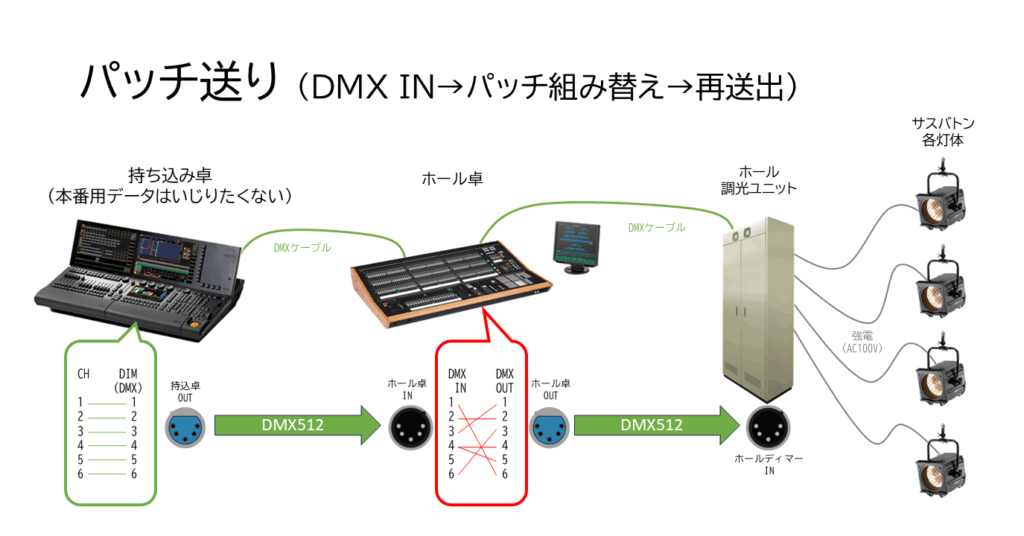 こんにちは。今回は舞台照明の現場、特にホールの現場でよく耳にする「パッチ送り(DMX IN / パッチスルー)」について解説します。 「パッチ」については別の記事で、「調光卓のチャンネル番号と、実際の機材のディマー番号(DMXアドレス)を紐付ける作業... -
